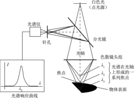 光源发出的具有宽光谱的复色光(如白光)穿过针孔后,近似为点光源。复色光经过分光镜(半透半反镜)后,照射在一组色散镜头组上。色散镜头组将复色光在光轴方向上分解成不同波长的单色光(λ1,λ2,λ3…),当被测物体放置在色散镜头组像平面附近的测量区域时,所有波长的光被反射回透镜组后,通过分光镜的反射面,反射至针孔,由放置在针孔后的光谱仪接收。由于点光源、物体表面某点、光谱仪前的针孔三者相互共轭,只有完美聚焦在被测物体表面的单色光才可以穿过针孔,由光谱分析仪确定其波长。因为每一个波长都预先对应于一个固定的距离值,因此通过确定光谱曲线峰值波长即可推算出对应的精确距离值。