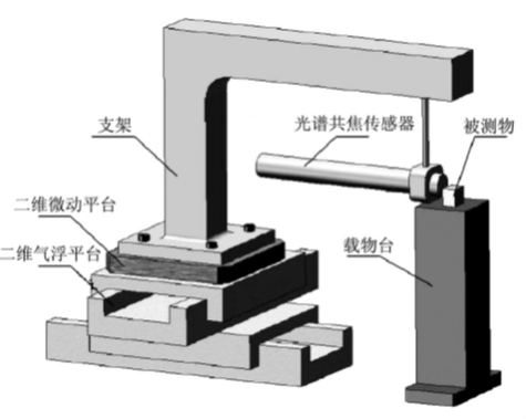 滚针对涡轮盘轮廓度检测的问题,利用光谱共焦式位移传感器实现涡轮盘轮廓度在线检测系统的设计。通过自行搭建的二维纳米测量定位装置,选用光谱共焦传感器作为测头,实现对超精密零件的二维尺寸测量,其结构示意图如图3所示。使用激光共焦位移计,配合二维精密控制微动台,对西汉的日光镜进行表面起伏深度的扫描,来探究光镜反光成像原理。
