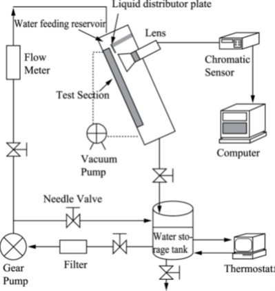 由于光谱共焦传感器对于不同的反射面反射回来的单色光的波长不同,因此对于材料的厚度精密测量具有独特的优势。光学玻璃、生物薄膜、平行平板等,两个反射面都会反射不同波长的单色光,进而只需一个传感器,即可推算出厚度,测量精度可达微米量级,且不损伤被测表面。讨论了利用光谱共焦位移传感器测量透明材料厚度的应用,计算了该系统的测量误差范围大概为0.005mm。提供了利用光谱共焦传感器对平行平板的厚度以及光学镜头的中心厚度进行测量的方法,并针对被测物体材料的色散对厚度测量精度的影响做了理论的分析。为了探究由流体跌落方式制备的薄膜厚度与跌落模式、雷诺数、底板的倾斜角度之间的关系,采用光谱共焦传感器实时监控制备后的薄膜厚度,其实验装置如图4所示。利用对顶安装的白光共焦传感器组,实现了对厚度为10~100μm的金属薄膜厚度及分布的精确测量,并进行了测量不确定度分析,得到系统的测量不确定度为0.12μm左右。