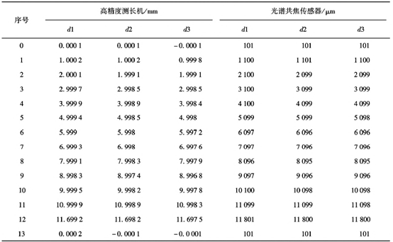 此次校准的光谱共焦传感器的最大量程为12mm,校准过程是从0开始,每隔1mm测1个点,记录下测长机和光谱共焦传感器的数据。由于光谱共焦传感器在12mm处即最大量程处容易超出测量范围使得数据无法采集,故最后一个点采集11.8mm处的数据。此次实验共测量3组数据,然后进行数据处理。测得的数据如表1所示。
