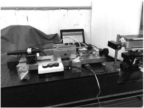 将光谱共焦传感器固定在大小合适的V型块上,V型块固定在高精度测长机的气浮平台上,打开光谱共焦传感器和高精度测长机的软件,开始测量。由于高精度测长机本身具有温度调节系统,故不需要记录校准时的温度。测量装置如图2所示。