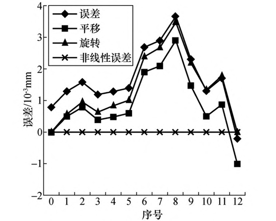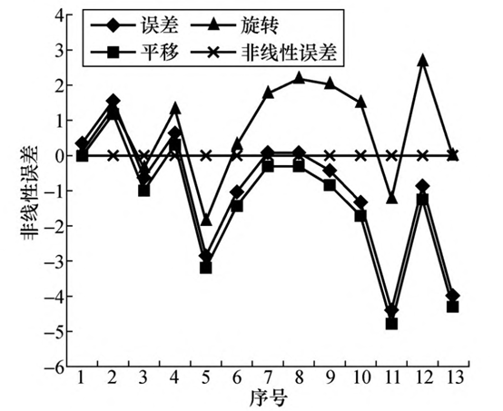 将表1所测数据的平均值代入式(4)计算得各点坐标到拟合直线的距离(负号代表点在拟合直线下方),即校准误差,如表3所示。