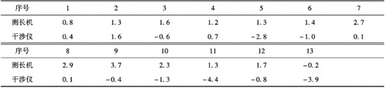 将测量装置按图3的方式安装,调整激光干涉仪与光谱共焦传感器的光路至一条直线上,然后将光谱共焦传感器移动至100µm处,并将激光干涉仪的示数归零,即可开始测量。由于测量前后消耗时间较长,为避免温度对测量结果产生影响,在每组数据测量开始前记录下激光干涉仪上所显示的温度,每组数据测量结束后也记录下激光干涉仪上所显示的温度。测得的数据如表2所示。