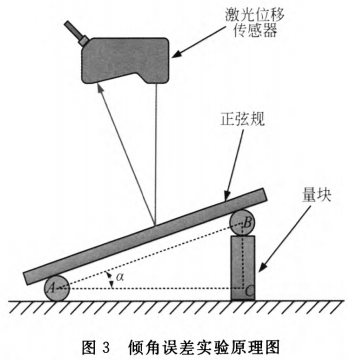 激光位移传感器的倾角误差实验装置由激光位移传感器、高精度激光干涉仪、正弦规、标准量块以及课题组自行研制的坐标测量系统等组成。如图3所示,把正弦规表面作为被测物面。正弦规的倾斜角度可以通过调整标准量块的高度来获得,其计算方法如下: