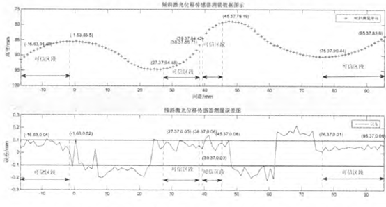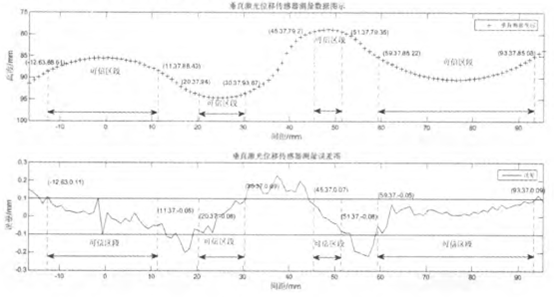 垂直激光位移传感器测量数据及相应误差如图3所示,在-12.63~11.37、20.37~30.37、45.37~51.37、59.37~93.37范围内,是可信区段,其误差均<100µm。同时也会存在其他点的误差<100µm,因为可信区段是保守估计;
