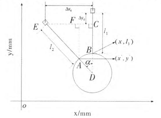 ① 首先将测量数据转化成与垂直传感器测量数据所用的坐标系。如图4所示,l1和l2分别为垂直和 倾斜激光位移传感器测量读数,α为两个传感器入射光线夹角,Δy0和Δx0分别为两个传感器的垂直和水平距离。点A和点B分别为倾斜和垂直传感器的入射光线 形成的点,其坐标分别为(x',y')和(X,l1),经转化后A点坐标为(x-Δx0+l2sinα,l2cosα+Δy0);