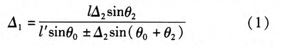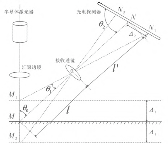 其中θ0为入射光线与接收透镜光轴的夹角;θ1为两条反射光线的夹角;θ2为光电探测器的接收面与接收透镜光轴的夹角;l为接收透镜物镜;l1为接收透镜的像距。被测物面相对于参考平面M上移时,取正号,下移时取负号。