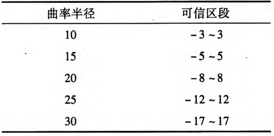 同理可分别测量出关于39.95mm和49.74mm两个半径圆柱截面的误差范围。在此文中定义将测量外圆柱形上凸截面轮廓或内圆柱形下凹截面轮廓的顶点或谷点的横坐标定为0,其左右的误差是在100µm以内的测量点的横坐标范围定为可信区段。为了处理在实际应用中的场合,文中可利用插值拟合出常见未知测量半径的圆柱型截面轮廓的可信区段,如表2所示。