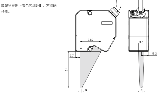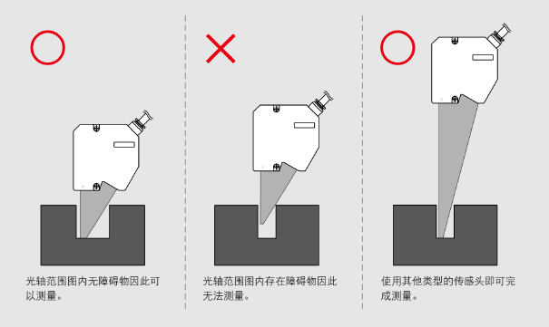 配合各种激光位移传感器型号,可以查阅不同位移传感器的光轴范围图(有障碍物时受干扰范围的示意图)