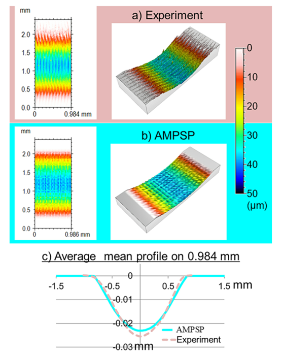 图1给出了实测的表面拓扑形貌和AMPSP预测的表面拓扑形貌。工件表面通过搭载光谱共焦位移传感器的三坐标测量机完成测量。三坐标测量机的分辨率为10纳米,测量面积为2.5毫米× 1毫米,并在两个方向上以4 μm间隔扫描。此外,为了评估预测的材料去除率的准确性,沿着1mm的凹槽计算了测量和模拟的轮廓的平均值。对比结果显示模型能够实现低于35%的材料去除量的定性预测,对于平面度和粗糙度的预测上能够达到低于10%的预测精度。