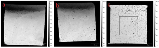 图1. Gwyddion软件中显示的从3个DMG70样品测得的轮廓仪数据,在0 (a)、5000(b)和10000 (c)周期中进行热循环。黑色点对应信号损失。图c上的正方形显示了计算粗糙度的区域,以避免来自样本边缘的任何偏差。