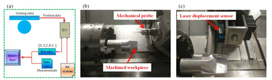 图3.用于加工工件轮廓测量的仪器配置。(a)自主研发的数据通信系统。(b) OMM采用机械探头。(c)采用激光三角位移传感器。