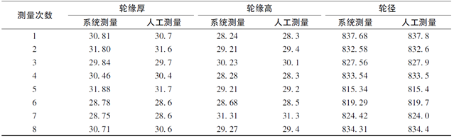 为验证系统测量的准确性,让8个不同车轮依次经过检测区域。每次均选取离激光线最近的拟合圆的直径作为车轮轮径。同时,采用轮径尺和车轮第四种检查器对车轮的轮对尺寸进行人工测量。为避免人工测量误差,对每个车轮的轮对尺寸进行多次人工测量,并去除粗大误差后取平均值,得到车轮最终的人工测量值。系统与人工测量结果如表1所示。