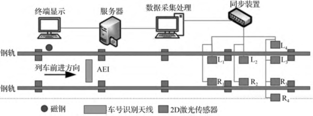 轮对尺寸在线检测系统由磁钢、车号识别天线、激光位移传感器及工控机等部分组成,如图1所示。