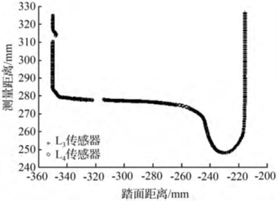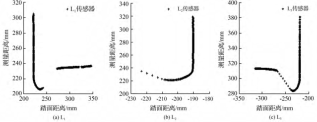 图10为传感器L1、L2、L3经滤波和坐标变换后的踏面数据。将传感器L2采集到的踏面形状与传感器L1和L3的采集到的踏面形状进行比较,可以明显看出,传感器L2因安装位置的影响,未能探测得到踏面数据。因此,提取传感器L2的基点需采用不同于传感器L1、L3基点的方法。