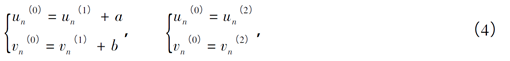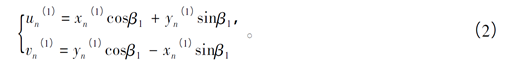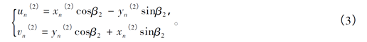 式中,(u(1),v(1))、(u(2),v(2))为两组传感器输出数据点在传感器自身坐标系内的坐标值,β、β分别为传感器L和L与纵向竖直线的夹角,(x(1),y(1))、(x(2),y(2))为经过坐标变换后在大地坐标系内的坐标值。