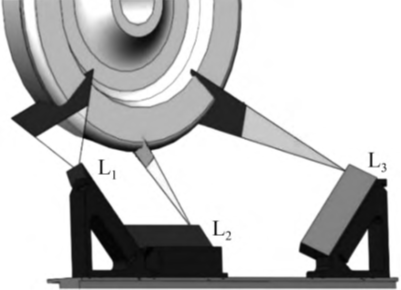 车轮踏面轮缘呈凸出状,因此,单个传感器难以实现整个踏面外形数据点的采集。为得到完整的踏面外形轮廓,在轨道两侧以一定角度和距离成镜面对称布置两个2D激光位移传感器L3和L4,而且,为使探测的车轮外形轮廓曲线在同一截面,需保证L3和L4的激光探测平面共面,传感器与车轮的安装位置示意图如图3所示。