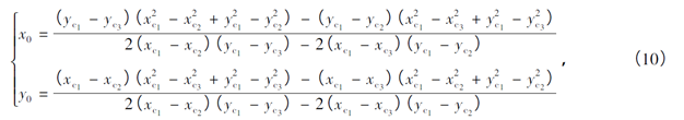 经上述计算,车轮滚动圆上的A、B、C3点坐标值已确定,则根据式(10)可确定滚动圆的圆心为: