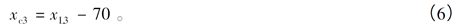 其中,ε为踏面内端面数据点横坐标差的设定阈值。由于踏面端面垂直于x轴,因此,以满足条件的横坐标值的平均值作为踏面内端面的横坐标,此横坐标即为端面的横坐标,记传感器L3的内端面的直线方程为x=xL3。距车轮内端面70mm处的踏面上的点为车轮基点,则L3采集到的踏面基点C的横坐标为: