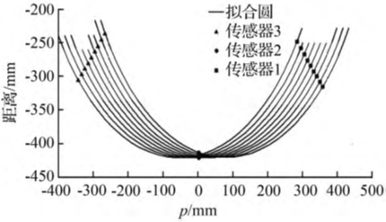 每个车轮在通过检测系统后传感器可输出若干组有效数据点,每组数据点进行直径测量时得到的拟合圆如图7所示。从图7中可以看出,拟合得到的车轮轮廓有大量的工作时间偏离中间位置,即此时传感器光源并未通过轮心,从而导致测得的踏面形状会发生一定拉伸变形,故需对多组数据点进行择优选取以提高轮径检测精度。