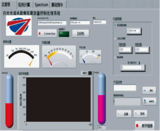 为了方便使用和测量,为控制系统开发了人机交互较为便捷的界面窗口,见图5,可方便的调控传感器相关参数指标,并预览扫描过程中的轮廓信息。还可以预设和编辑扫描运动策略,调整存储数据的名称等功能,并额外的增加了光谱信号展示、集成轮廓滤波与评价方法等功能,可以实现扫描测量后及时的数据输出。