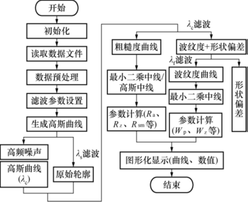 在轮廓处理算法中增加了整体轮廓预览、波纹度分析和数据整体等功能模块,其算法设计流程如图7所示,图7中的相关参数在GB/T3505中已作了明确定义。