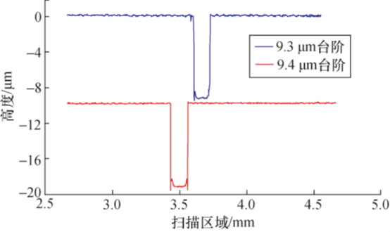 测试所用的标准样品上刻有两个测试台阶位置,其标称高度分别为9.3μm和9.4μm。利用搭建的测量系统沿台阶垂直方向对该样板进行扫描,对测量采集的数据轮廓进行校平、最小二乘拟合等处理,计算得两处台阶位置高度差分别为9.27μm、9.36μm,台阶轮廓如图8所示。