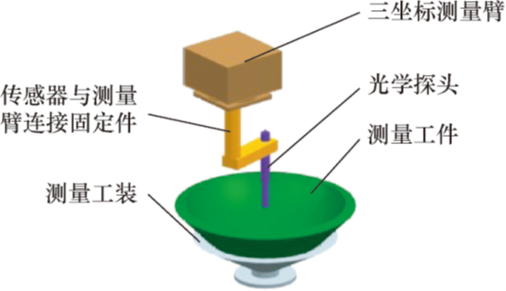 根据系统结构特点和坐标测量机测量臂末端接口形式,将光学探头通过转接紧固件可靠固定在测量臂末端,如图2所示。