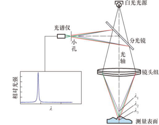 通过特殊光学设计形成的透镜组将白光光源发出的多色平行光进行光谱分光,形成一系列波长不同的单色光,同时再将其同轴聚焦,由此在有效量程范围内形成了一个焦点组,每一个焦点的单色光波长都对应着一个轴向位置。测量时通过光谱仪分析光谱峰值结合峰值提取算法从而确定被测点的高度位置信息。