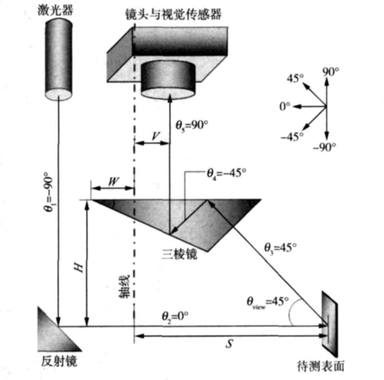 3中的轴线为检测装置的轴线,设轴线到待测表面的距离为S。因装置中激光发射器、反射镜与三棱镜已经定位并固定,则可计算出三棱镜上边到激光线水平段的高度H、三棱镜25°角的顶点到轴线的距离W,再设轴线到射入镜头的激光线的距离为V。由几何光学知识可求得: