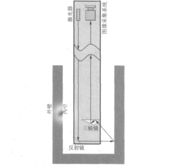由于圆筒内径的限制,可能会小到80mm左右,激光无法照射整个内壁表面;又由于圆筒温度高达100℃,激光三角测量装置不能直接伸入到圆筒内部进行检测,所以需要对传统的激光三角法检测方案进行改进。