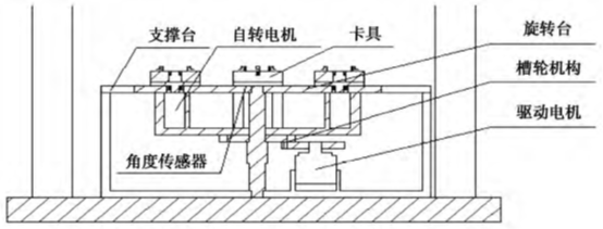 装置中设计的槽轮机构用于测量一组(四个)被测物小孔内壁。此间歇机构能够留有足够时间来完成小孔不同位置深度的内壁检测。并且在槽轮机构不起作用的3/4圈处,可对其他几个卡具位置进行拆卸和安装零部件,即完成在线测量。主动轮在电机作用下带动从动轮,从动轮带动每个待测小孔运动到指定位置以便测头检测。