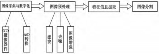 CCD图像传感器接收光信号并转换为电信号,通过A/D转换获得数字信号。要完成缺陷识别先将已数字化的图像进行预处理得到二值图像,然后进行特征提取,最后对病灶缺陷进行识别分类。图8为内表面缺陷识别过程,具体过程如下: