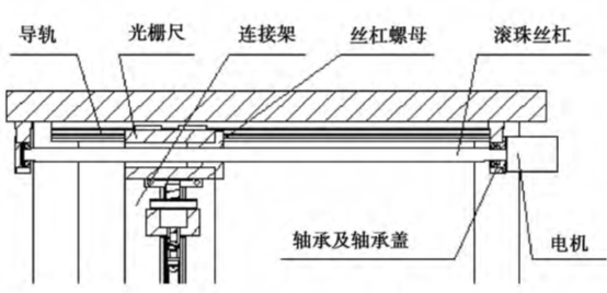 水平运动系统如图3所示:包括水平导轨、连接架、滚柱丝杠、丝杠螺母、电机以及轴承和轴承盖。其作用是当被测量件放置在旋转装置的旋转台上时,水平运动调整光学测量装置,使其与被测量小孔对中,实现在线测量。防止光学测量装置在与小孔不对中的情况下,即与小孔内壁产生相对距离,使得光学测量装置与小孔内壁产生摩擦或者测量时光学测量装置相对小孔内壁偏心,甚至无法进入小孔进行测量的现象发生;另外,当被测零件无法安装在旋转台上进行在线测量时,可将其放置在支撑台上,使水平装置运动,与小孔进行对中,从而实现测量。即水平运动系统作用是配合测量多个测量物。