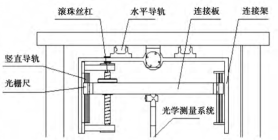 升降运动系统如图4所示:水平运动系统带动升降运动系统及光学测量系统在水平方向上运动,竖直运动系统则带动光学测量系统在竖直方向上运动,包括竖直导轨、滚珠丝杠、电机及连接板等。测量前,调整水平运动系统使得光学测量系统和小孔对中,升降运动系统带动光学测量系统进行测量,通过竖直光栅尺读出光学测量系统检测到的小孔内壁疵病的轴向位置。