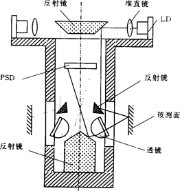 测量时,由激光器(LD)发出的准直光束聚焦于被测内表面上。经被测面反射的发散光被平短模凸透镜会聚,再由平面反射镜将光反射至一维位置检测器(PSD)上。如果测量之前,标定好PSD,则工件的内尺寸就可以通过光点在PSD上的位置来确定。如果测量光面没在柱状表面的径向上,可以通过沿垂直纸面方向移动测头,直至找到测量的最大值为止。