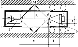设激光束由A点投射到被测面M点上。R是传感器中心线到点M的距离。通过焦距为f的接收透镜对散射光的聚集作用,点M在CCD上成像于N点。r为CCD上与R有关的环状图象的半径,m是光线出射点A到接收透镜中心O之间的距离。被测尺寸R与CCD敏感面上的圆形图象半径r之间的关系为