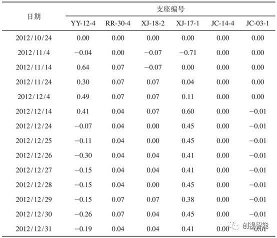 (1)2012年9~12月首次在首都机场线采用激光位移传感器监测病害支座处桥梁梁体竖向、横向和纵向位移,在机场线1号、4号、5号桥病害支座处梁体布设7个监测点。表2给出了机场线部分病害支座处梁体纵向位移情况。由表2可以看出,梁体纵向位移数据稳定在10mm内。横向位移最大值为1.23mm,竖向位移最大值为-1.09mm,均在设计控制值内,见表3,表明梁体位移在可控范围内,支座处于稳定状态。
