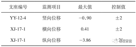 支座编号监测项目最大值控制值YY-12-4竖向位移-0.90±2XJ-17-1横向位移0.41±2XJ-17-1纵向位移-3.86±20