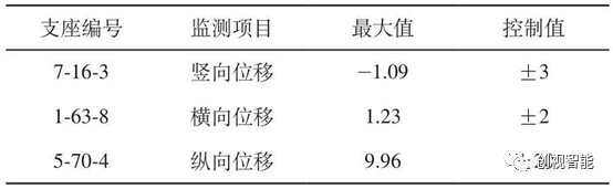 支座编号监测项目最大值控制值7-16-3竖向位移-1.09±31-63-8横向位移1.23±25-70-4纵向位移9.96±20