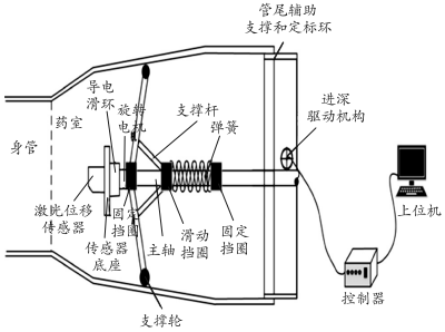 其中,支撑机构通过支撑爪带着旋转机构在火炮药室内做轴向进退或支撑,旋转机构通过悬臂带动位移传感器在火炮药室内做径向旋转扫描;根据不同的药室直径选择不同的激光位移传感器,测量时电机带动激光传感器运动完成火炮身管药室的整周测量。激光位移传感器根据药室直径的变化,产生对应的电信号,该信号经适配器处理后,由上位机测量软件作进一步采集、显示、处理,得到药室直径尺寸测量数据,单次截面整周扫描可获得成百上千个内径测量值,同时获取被测截面轮廓图形。