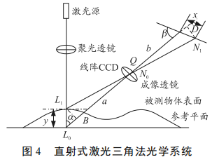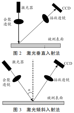 激光三角法是采用激光位移传感器进行距离测量的方法,又可分为直射式和斜射式 2 种[1]:1) 直射式是指入射光线垂直于照射物体表面,其光路图 如图2 所示;2) 斜射式是指入射光线与物体表面的法线成一定角度,其光路图 如图3 所示。