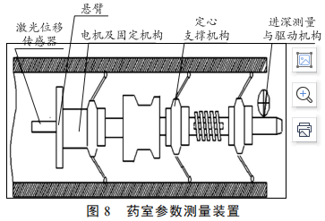 如图8 所示,进入药室内进行测量的本体由激光位移传感器、悬臂、电机及固定机构、数据处理与传输模块、定心支撑机构、进深测量与驱动机构等组成。
