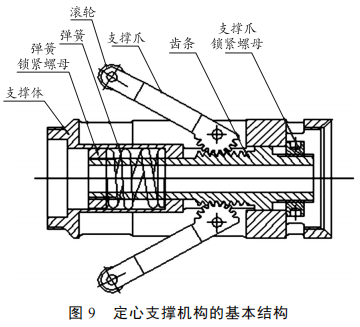 定心支撑装置,采用 4 爪定心装置,置于激光位移传感器的后部,由弹簧给 4 个定心爪施加外力,使它们同时顶向身管内壁,以保证测量头始终位于炮管轴心。支撑机构是弹性伞型支架,测量本体定心支撑机构的基本结构如图 9 所示。支撑爪一端所装的滚轮在药室内表面上滚动,另一端被加工成齿状,与齿条啮合。齿条在弹簧推力的作用下在支撑体中滑动,带动支撑爪张开与闭合,以适应药室内径的变化。由于采用 4 个完全相同的联动支撑爪,某一个支撑爪的微小变化都将会带动其余 3 个同时实现张开或闭合,定心装置具有良好的自动定心作用。