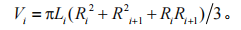 火炮身管药室容积根据每一步的进深和半径测量结果计算求得。首先根据各个测量截面的半径和进深,计算出第 i 个圆锥台的体积为: