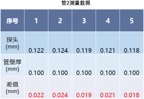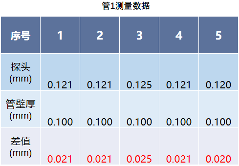 首先我们选择两根0.1mm(为出厂标注厚度)细管样品进行壁厚测量如下图,要求精度保持在±0.025mm范围内,我们对两根细管分别取5个点进行测量并记录每个点的静态测量数据。